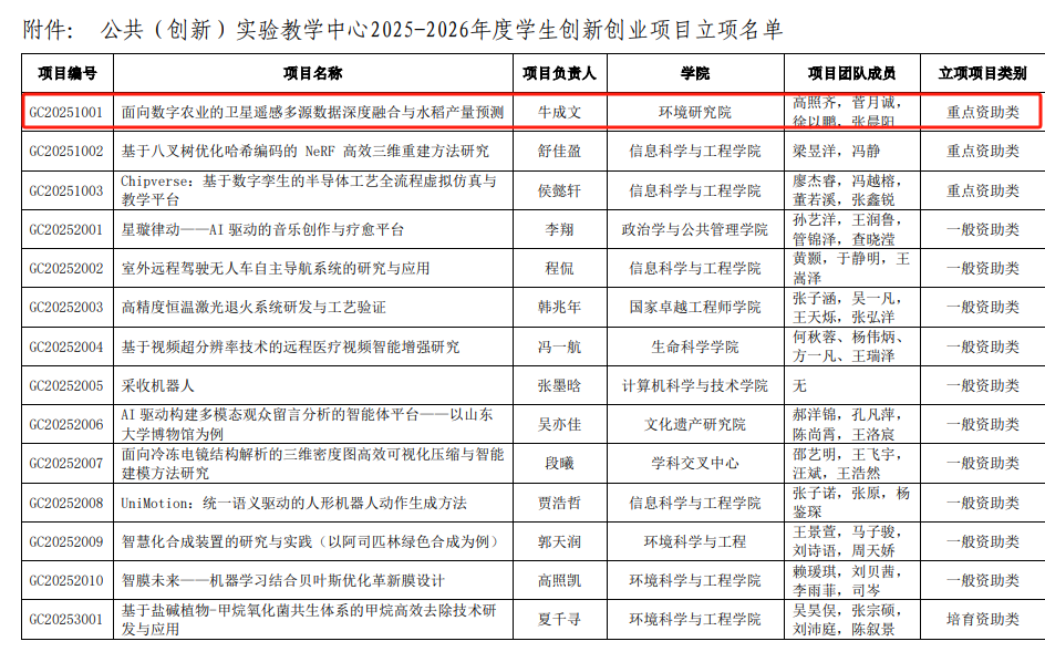 12月27日,山东大学(青岛)2025–2026年度学生创新创业项目立项结果公示,环境研究院申报的《面向数字农业的卫星遥感多源数据深度融合与水稻产量预测》项目,成功获批重点资助类项目立项。