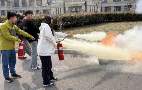 在室外的灭火器实操环节,孙老师现场指导学生分组进行操作。学生们踊跃参与,在其专业指导下,认真完成每一个动作,切实将理论知识转化为实操技能,进一步筑牢了消防安全实操能力基础。